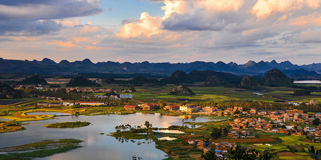 (舞台背景开始转换,呈现出云南的壮丽景色。)